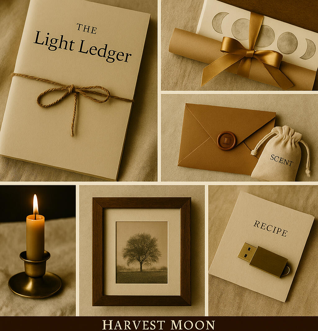 The keepsake you make can take its place in your home where it can be enjoyed each day.Inside the Heritage Table — a leather-bound heirloom where recipes aren’t merely written, but preserved for generations — rests your Harvest Moon recipe. Its scent drifts through the season each time it’s baked, becoming as much a part of your home as the memories you make around it.The candle, once lit to begin your time together, can be rekindled in quiet moments — its glow carrying the memory into future nights.The story can be revisited whenever the moment feels right, deepening its place in your family’s lore.And as the weeks unfold, new notes and reflections can be added to your Light Ledger, carrying the memory forward.